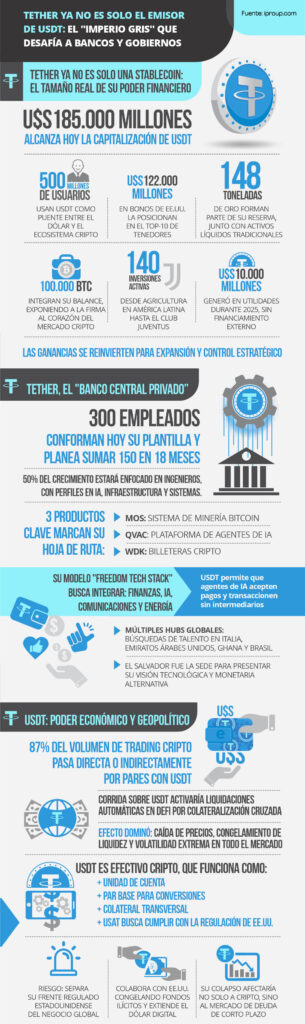 Con una capitalización de u$s 185.000 millones y una posición estratégica en bonos del Tesoro estadounidense, Tether trasciende su rol de emisor para consolidarse como un actor geopolítico. Su expansión hacia la infraestructura tecnológica y energética plantea un desafío sistémico a la banca tradicional y a los marcos regulatorios vigentes.